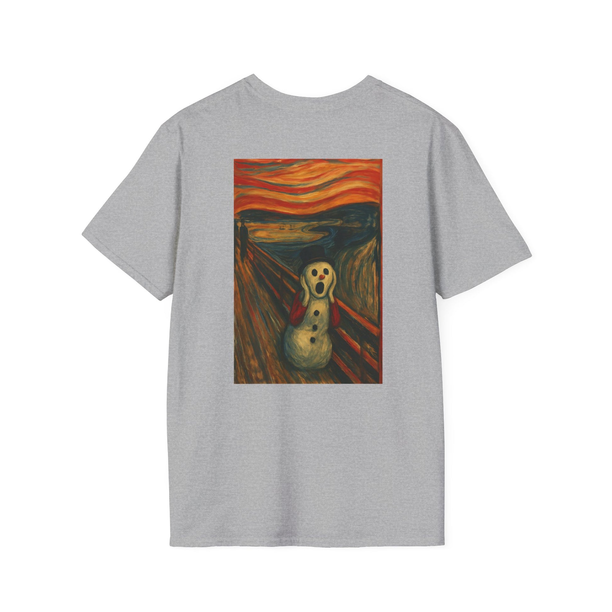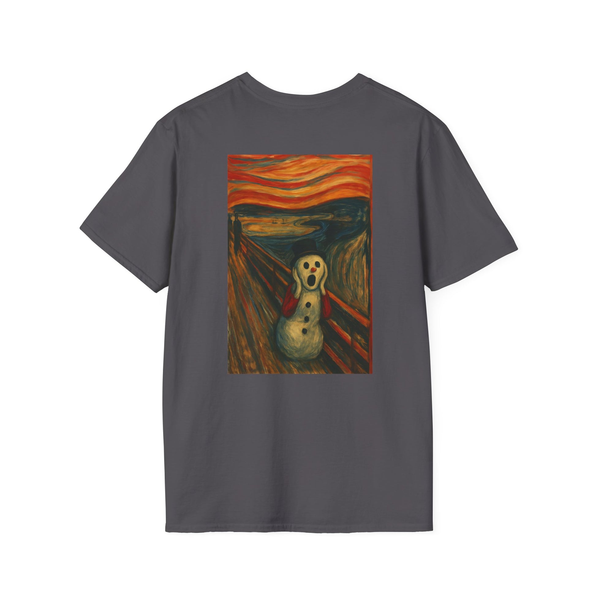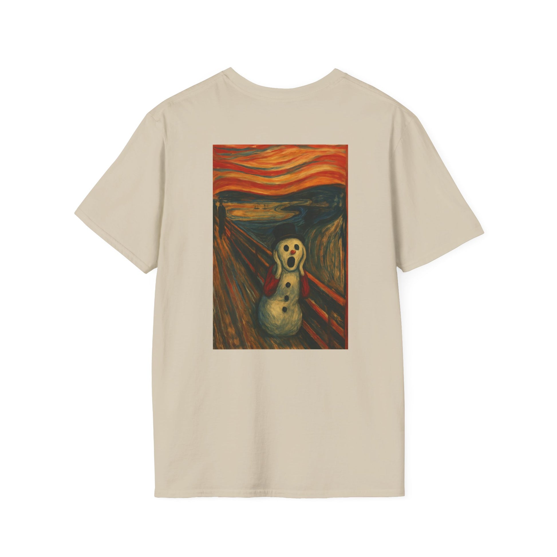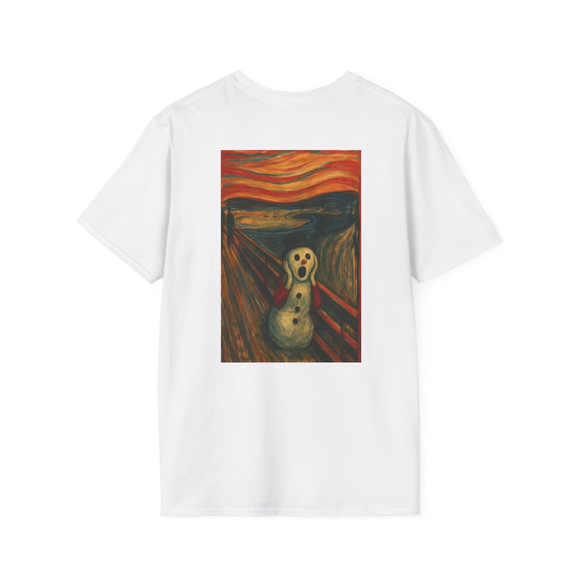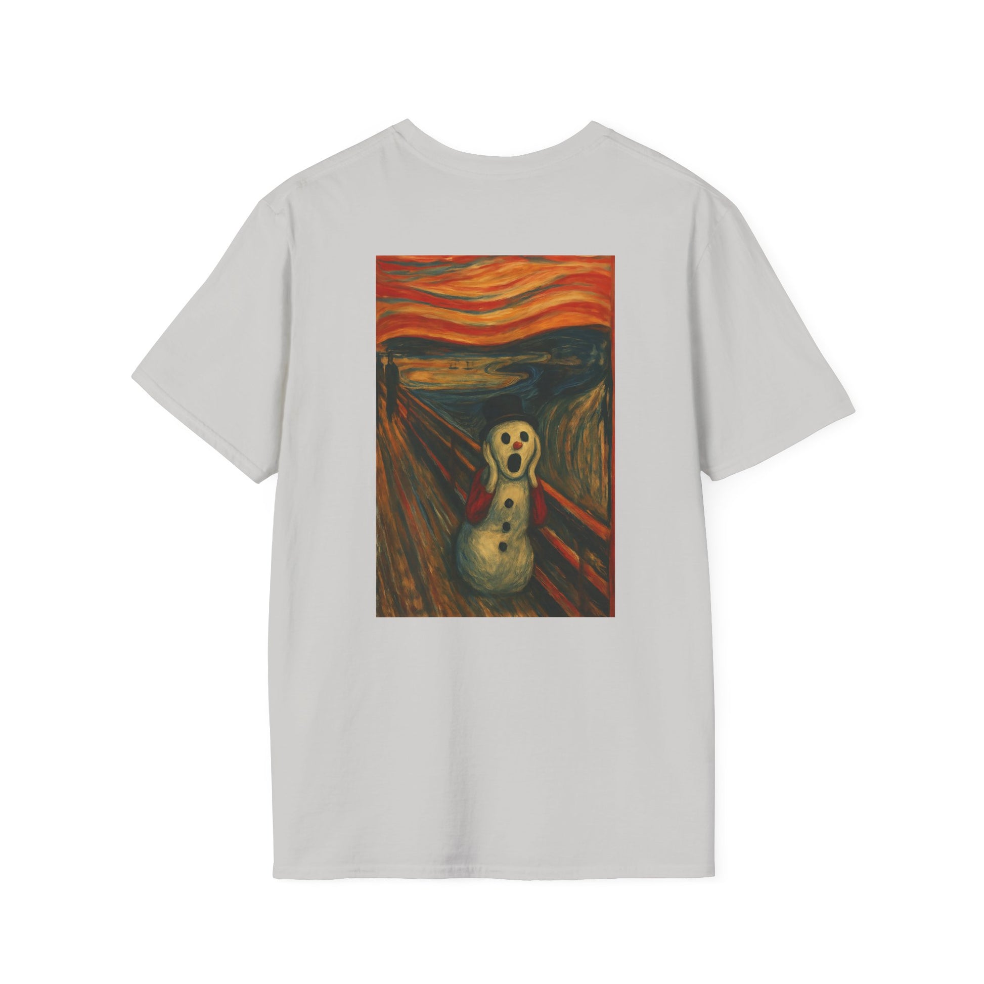 A soft, breathable tee that carries a playful, artful twist — a crisp print of a snowman version of Edvard Munch’s The Scream on the front (and back), ready to spark smiles and conversation. Lightweight ring-spun cotton drapes easily over the body, while a classic crew neckline and clean fit keep the look relaxed and wearable. The image brings a touch of offbeat humor and museum-inspired charm to everyday outfits: wear it layered under a coat for chilly walks, to relaxed gallery nights, or to casual gatherings where you want a little ironic warmth. Ethically sourced cotton and quality printing mean the colors stay vivid and the shirt feels gentle against the skin, wash after wash.