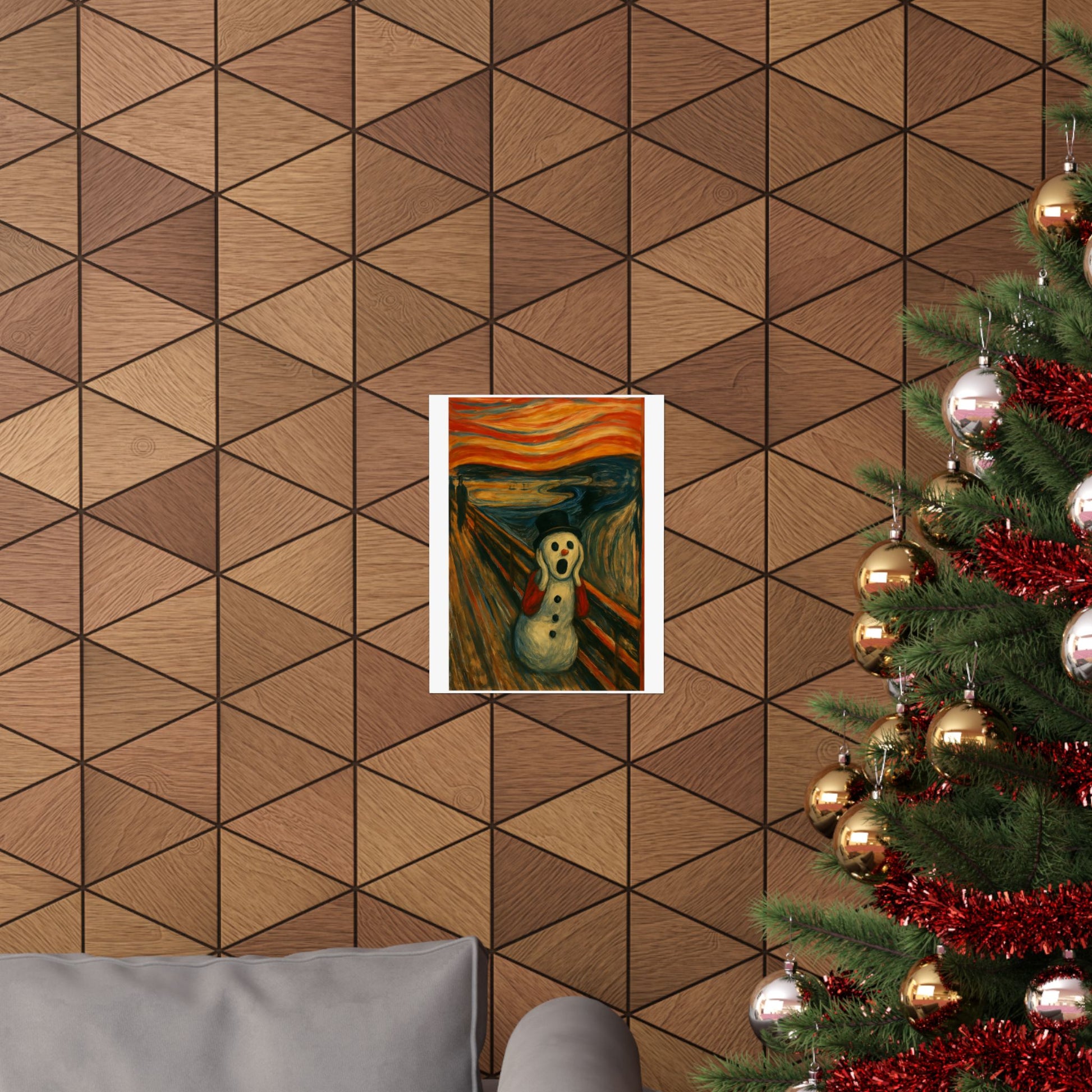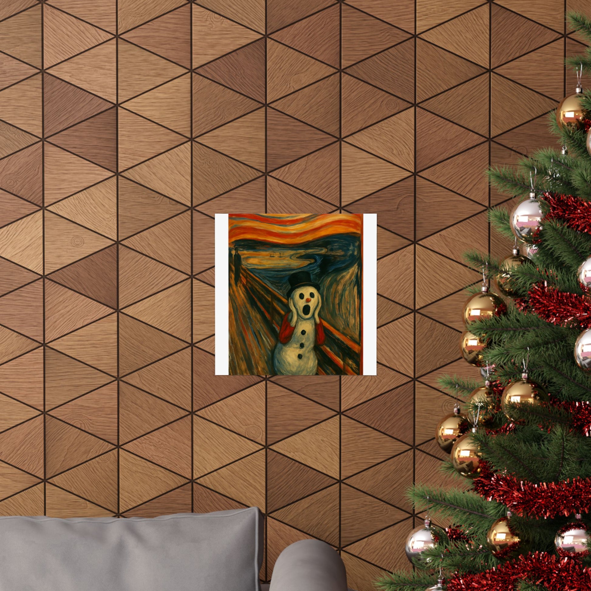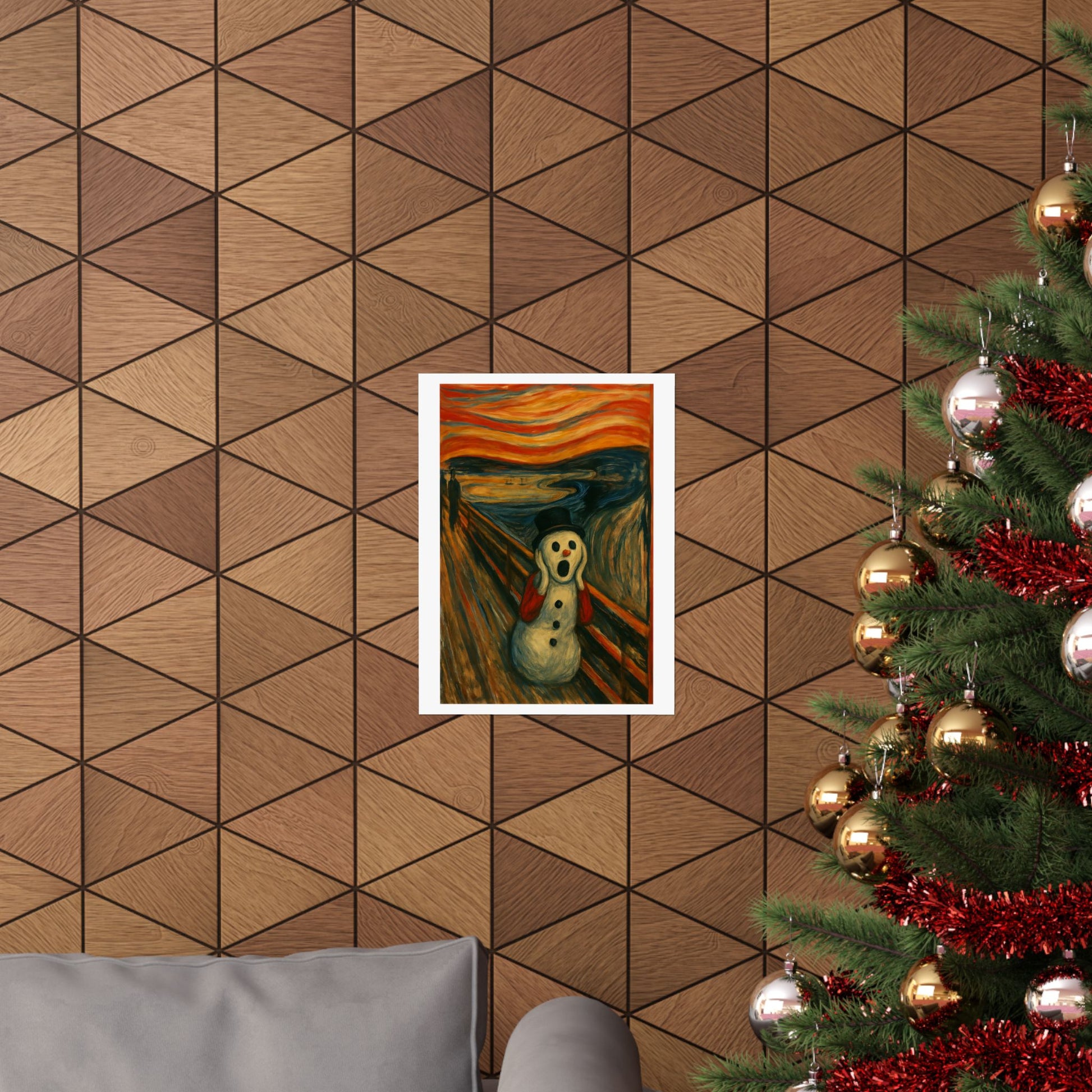 Matte vertical poster printed on archival museum‑grade paper that holds color and detail like a fine print. The image captures a surreal, wintry twist on an iconic expressionist scene — a wide-eyed snow figure framed by glowing, stormy skies and restless brushstrokes. Hung in a narrow hallway, over a mantel, or inside a cozy studio, this vertical poster brings a charged, contemplative energy to indoor walls. The matte surface keeps glare low and the rich giclée inks stay vivid through regular sunlight. Available in many sizes to fit slim wall spaces or tall frames; small manufacturing tolerances ensure each piece is carefully produced and long-lasting.