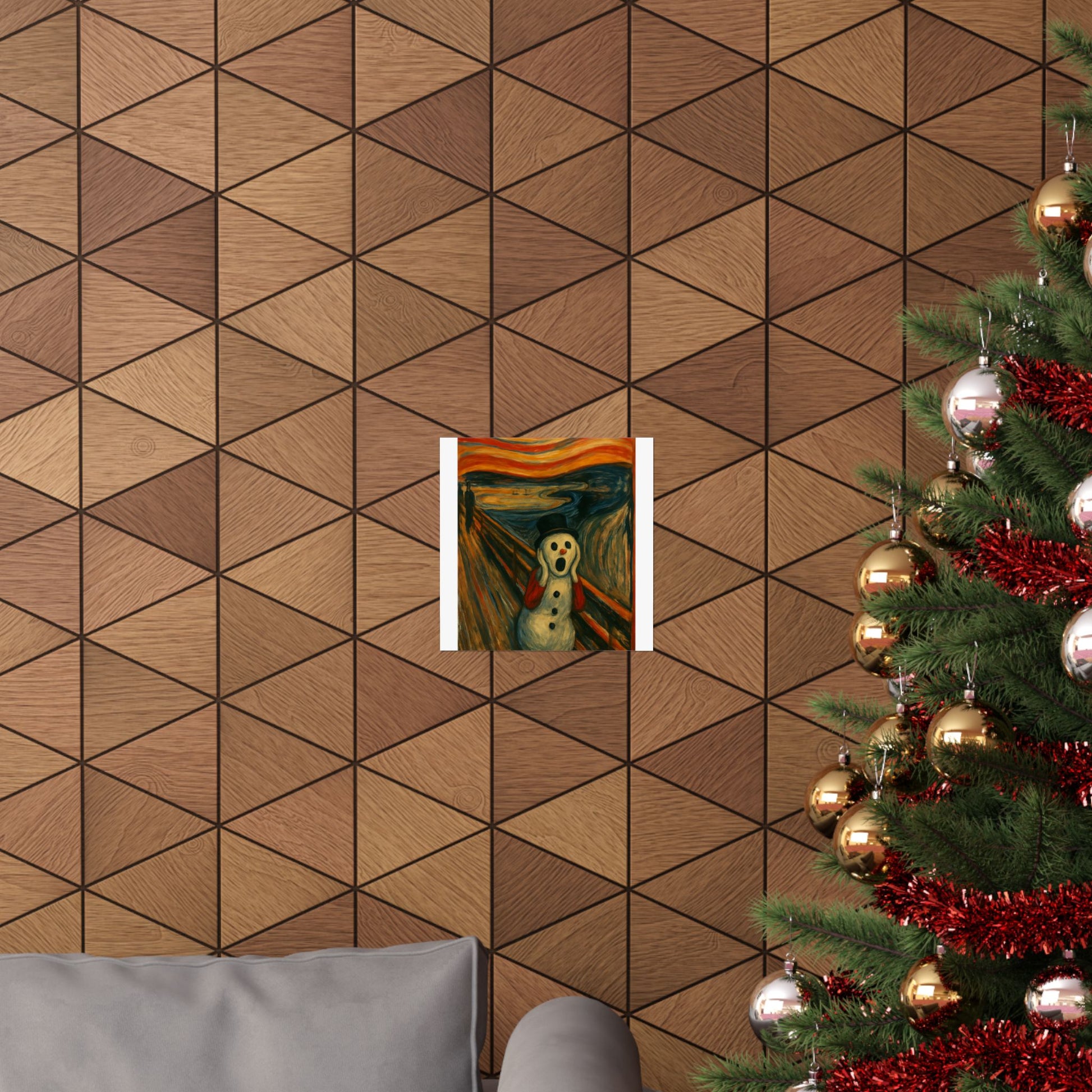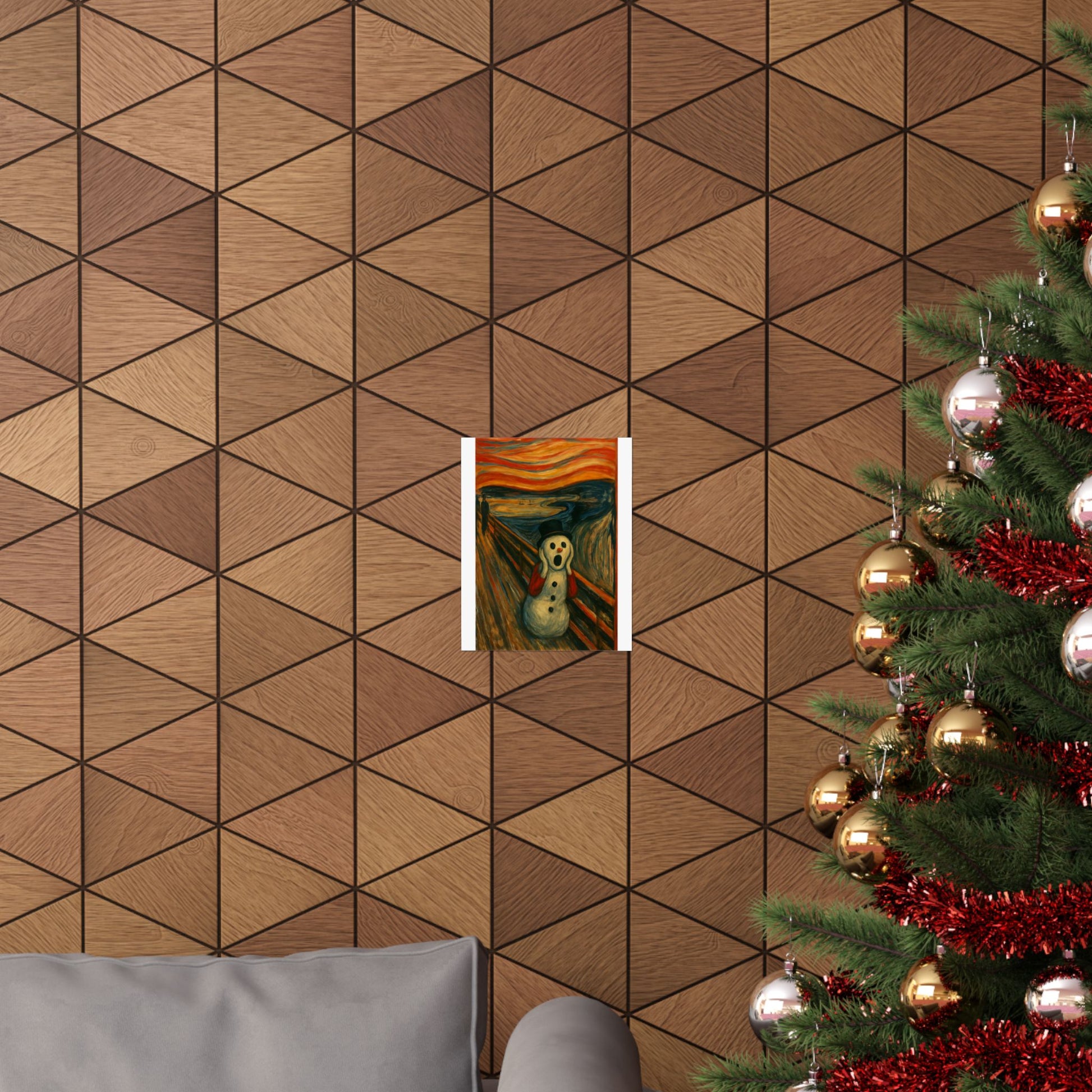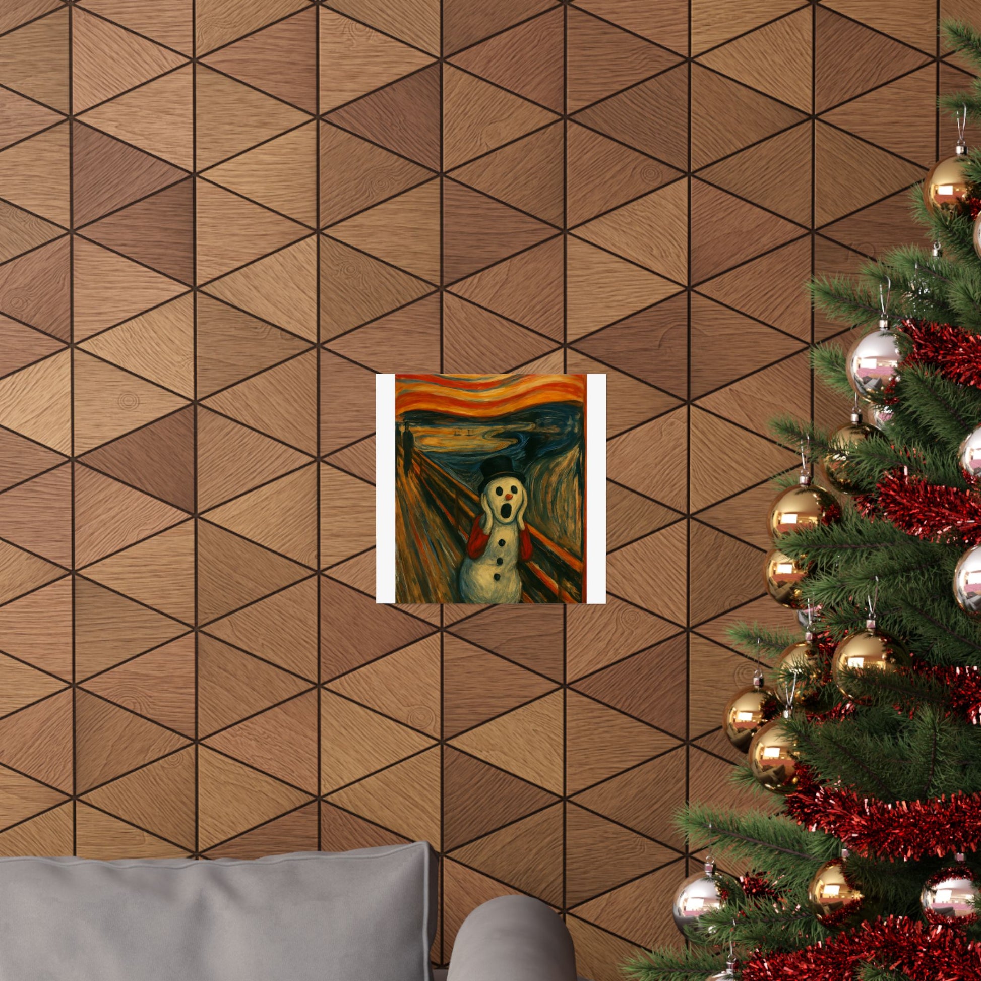 Matte vertical poster printed on archival museum‑grade paper that holds color and detail like a fine print. The image captures a surreal, wintry twist on an iconic expressionist scene — a wide-eyed snow figure framed by glowing, stormy skies and restless brushstrokes. Hung in a narrow hallway, over a mantel, or inside a cozy studio, this vertical poster brings a charged, contemplative energy to indoor walls. The matte surface keeps glare low and the rich giclée inks stay vivid through regular sunlight. Available in many sizes to fit slim wall spaces or tall frames; small manufacturing tolerances ensure each piece is carefully produced and long-lasting.